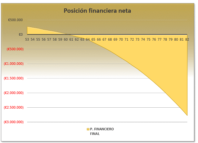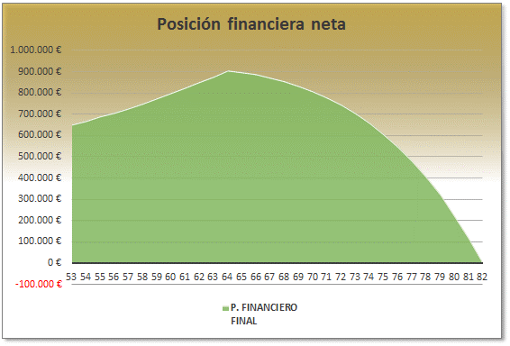 a posición financiera neta a lo largo de su vida, refleja la proyección de cash flows en base a los datos proporcionados por el cliente. En esta proyección se tienen en cuenta todos los ingresos y gastos esperados del cliente, así en la proyección se estiman cada uno de ellos en base a los datos financiero fiscales, en un periodo desde los 53 hasta los 90 años.